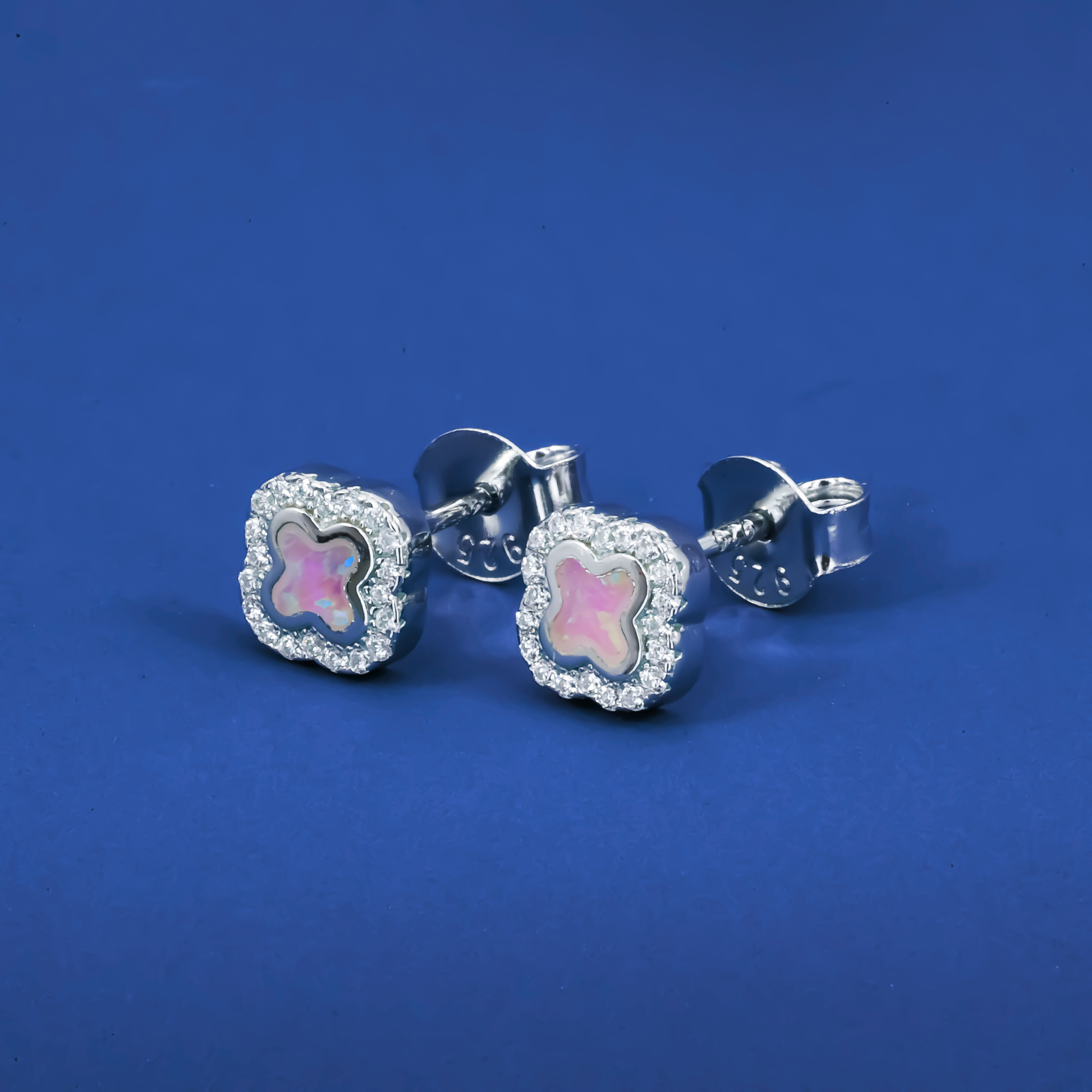 Iridescent Opal Clover Stud Earrings – Sterling Silver CZ Halo Design
